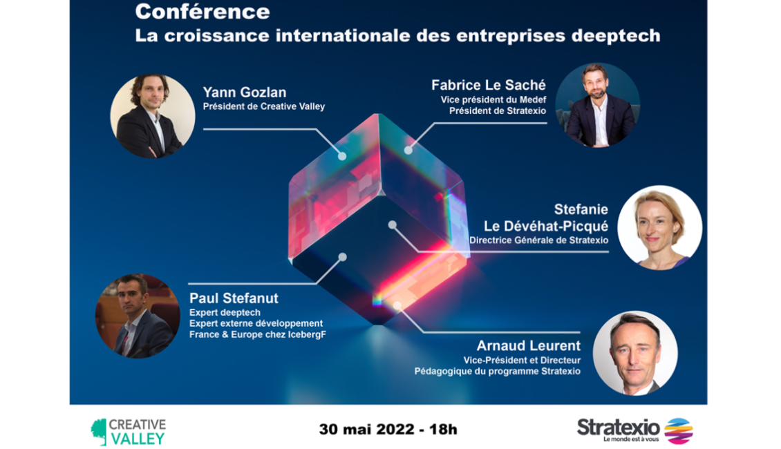 Stratexio, au service de la croissance internationale, déploie une démarche collaborative entre chefs d’entreprise. Parmi les éléments structurant du programme : échanges d’informations, partage d’expérience, réflexion collective aux interrogations individuelles, amélioration des approches de marché, renforcement des méthodologies existantes, identification des optimisations, acquisition d’expertises extérieures, témoignages de leaders économiques, accès aux réseaux croisés de la 1ère plateforme du secteur privé dédié à l’international. Cette conférence nous donnera l’occasion de challenger les outils de Stratexio face au besoin de la deeptech.