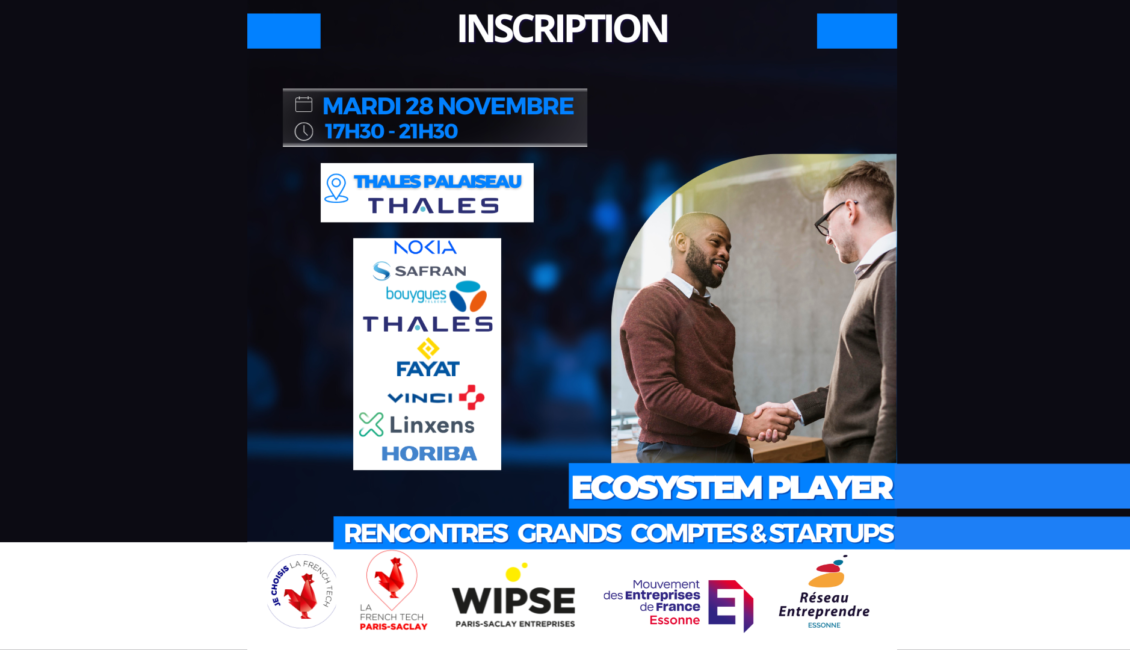 Participez au premier événement, “ECOSYSTEM PLAYER – Rencontres Grands comptes & Start-up”, organisé le 28 novembre par La French Tech Paris-Saclay, Réseau Entreprendre Essonne, le WIPSE – Paris Saclay Entreprises et le MEDEF Essonne.
