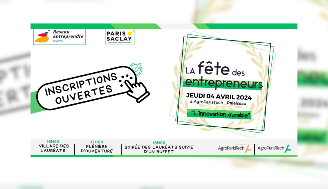 Réseau Entreprendre Essonne et la Communauté d’agglomération Paris-Saclay vous invitent à “La Fête des Entrepreneurs 2024” sur le thème de « l’Innovation durable » , une cérémonie qui récompense les lauréats 2023.