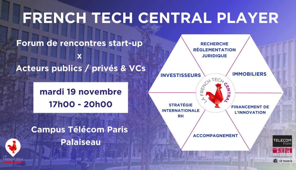 La French Tech Paris-Saclay vous convie à son édition 2024 “French Tech Central Player” Forum de rencontres entre start-up x acteurs publics et privés, sponsorisé par l’école Télécom Paris qui vous reçoit au sein de son campus de Palaiseau le mardi 19 novembre dès 17h00.