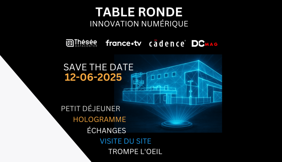 Notre partenaire Thésée datacenter a le plaisir de vous convier à un événement exclusif coorganisé avec France Télévisions, Cadence Wattdesign et Data Center Magazine, autour d’une thématique au cœur des enjeux technologiques actuels.