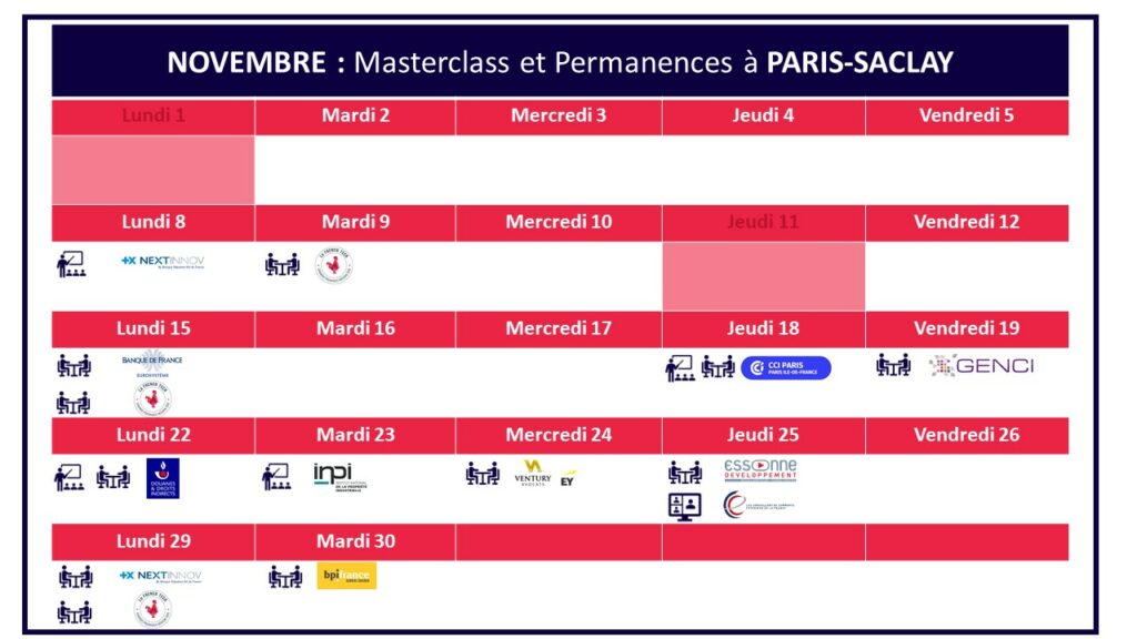 Lundi 15 novembre : Banque de France 14h00-18h00 Permanence one-to-one Banque de France @ Playground Inscription ICI9h00-18h00 Permanence one-to-one French Tech Paris-Saclay @ SQY Cub Inscription ICI