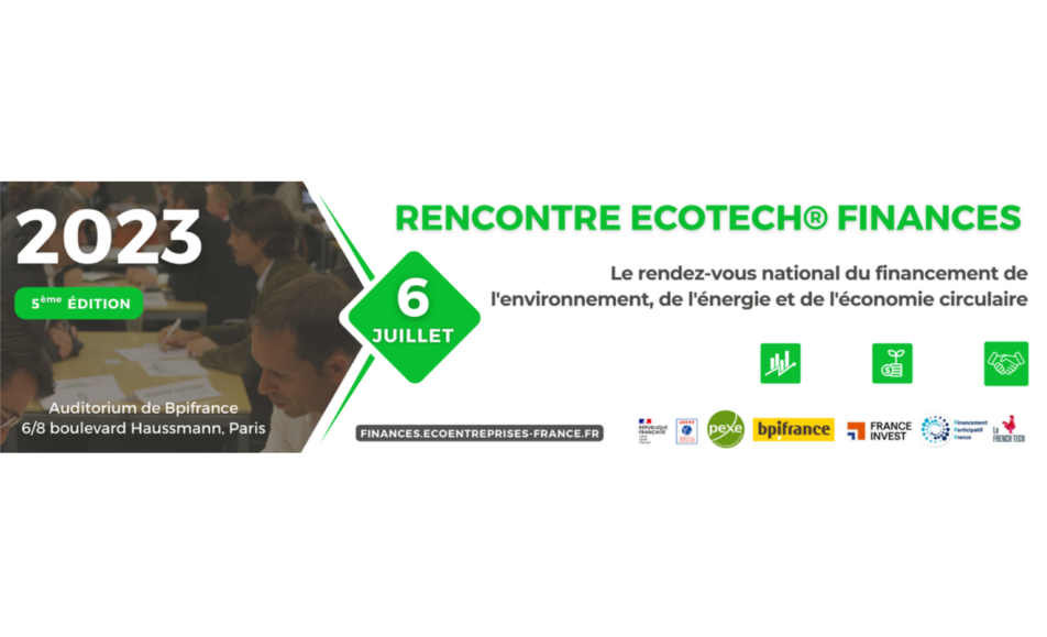 Participez à la 5ème Rencontre Ecotech Finances, pour une mise en relation EFFICACE entre les investisseurs de la transition écologique et énergétique et les entreprises Startup/TPE/PME/ETI de l’environnement et de l’énergie en recherche de financement ou en perspective de levée...