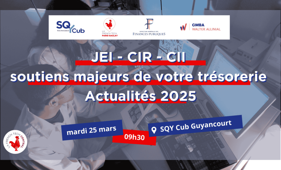 Les sujets incontournables de La French Tech Paris-Saclay ! Entrepreneurs et start-up du 78 et 91, Retrouvons nous le mardi 25 mars à 09h30 au SQY Cub à Guyancourt Au programme : l’actualité sur le statut JEI (Jeune entreprise innovante, les crédit d’impôts...