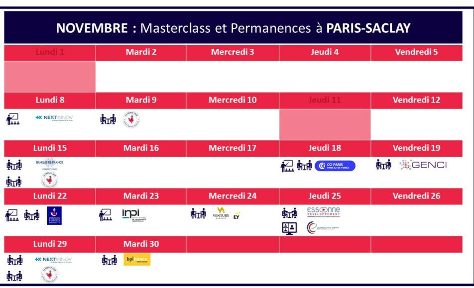 Lundi 8 novembre : Banque Populaire Val de France (BPVF) 11h45-12h30 Webinaire "présentation du programme d’accompagnement NEXTINNOV by BPVF » @ visio Inscription ICI Mardi 9 novembre : La French Tech Paris-Saclay 9h00-18h00 Permanence one-to-one French Tech Paris-Saclay @ Accélair Inscription...