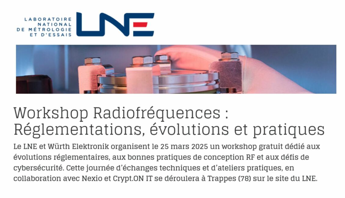 Le LNE et Würth Elektronik organisent le 25 mars 2025 un workshop gratuit dédié aux évolutions réglementaires, aux bonnes pratiques de conception RF et aux défis de cybersécurité. Cette journée d’échanges techniques et d’ateliers pratiques, en collaboration avec Nexio et Crypt.ON IT se déroulera à Trappes (78) sur le site du LNE.