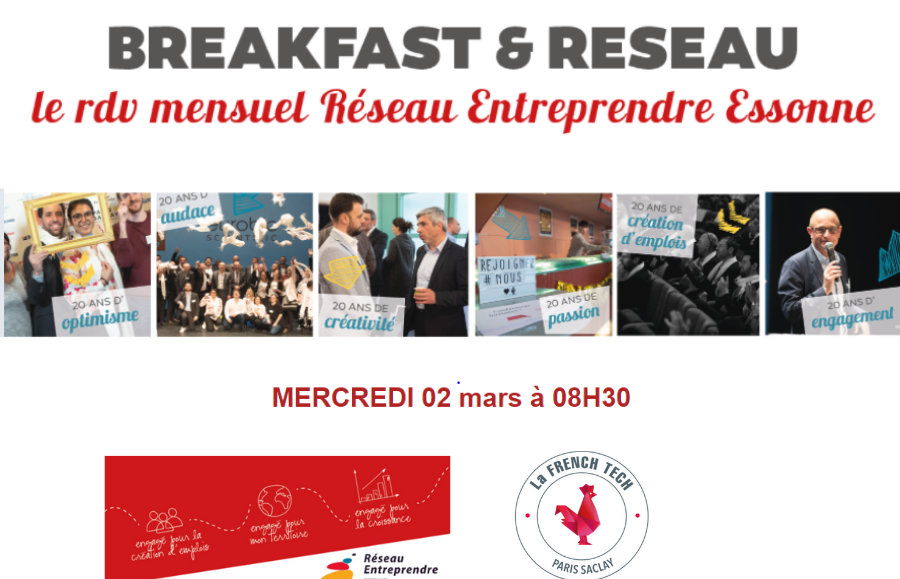 Le rdv mensuel Réseau Entreprendre Essone organisé avec La French Tech Paris Saclay aura lieu mardi 2 mars à 8h30. Au Programme Témoignages DUO – Accompagnatrice/lauréat Stéphanie TONDINI & Eric D’HAENE
