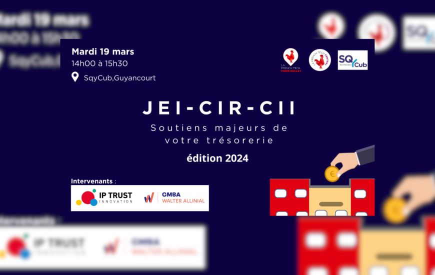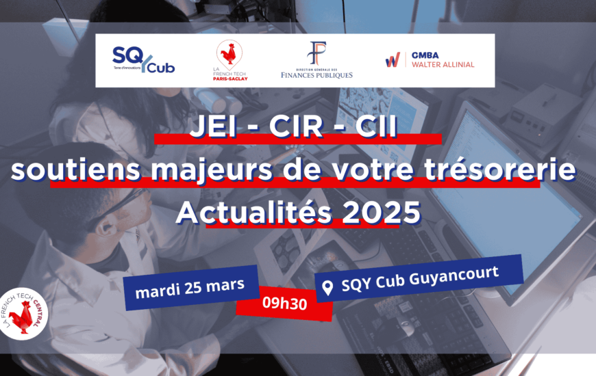 Les sujets incontournables de La French Tech Paris-Saclay! Entrepreneurs et start-up du 78 et 91, Retrouvons nous le mardi 19 mars à 14h00 à Sqy Cub pour une masterclass exclusive ! Au programme : Le statut JEI (Jeune entreprise innovante) et les crédit d’impôts...