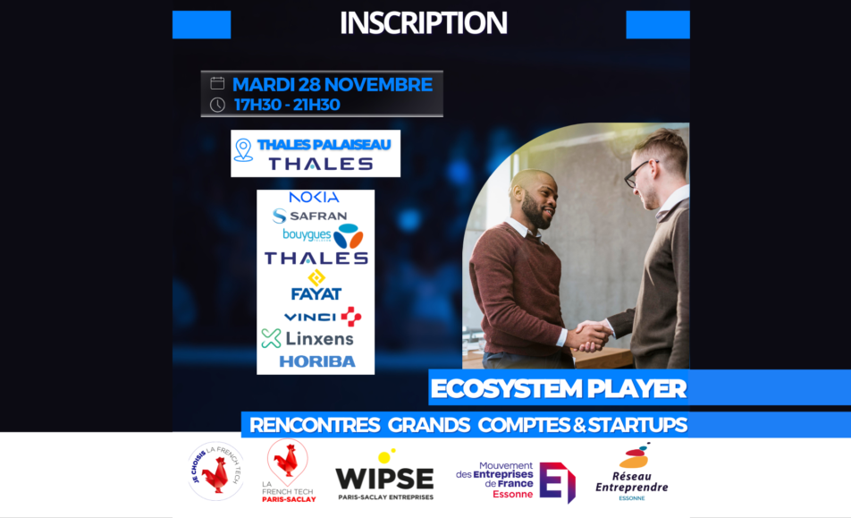 Participez au premier événement, "ECOSYSTEM PLAYER - Rencontres Grands comptes & Start-up", organisé le 28 novembre par La French Tech Paris-Saclay, Réseau Entreprendre Essonne, le WIPSE - Paris Saclay Entreprises et le MEDEF Essonne.