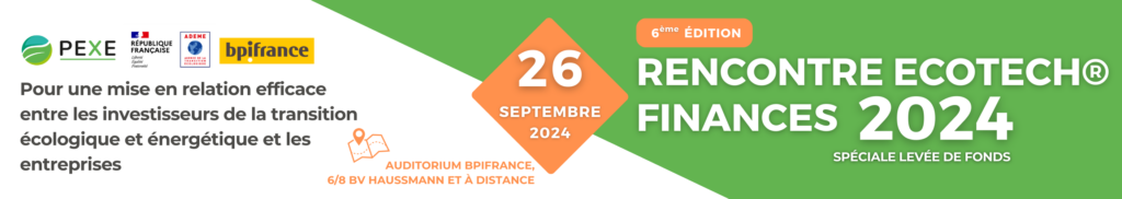 Like every year, PEXE is organizing the 6th edition of the Ecotech© Finance Meeting, the benchmark event for connecting investors and companies involved in the ecological and energy transition, in conjunction with ADEME and Bpifrance.
